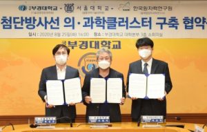 부산 기장군 장안읍 동남권 방사선 의·과학 산업단지를 세계적 첨단 클러스터로 추진하기 위한 교육·연구사업이 추진된 26일 부경대에 따르면 부경대 기술경영대학원, 한국원자력연구원 융복합양자과학연구소, 서울대 융합과학기술대학기관이 25일 오후 부경대에서 '기장 첨단 방사선 의·과학클러스터 구축 사업'을 위한 합의 각서(MOA)를 교환했다.